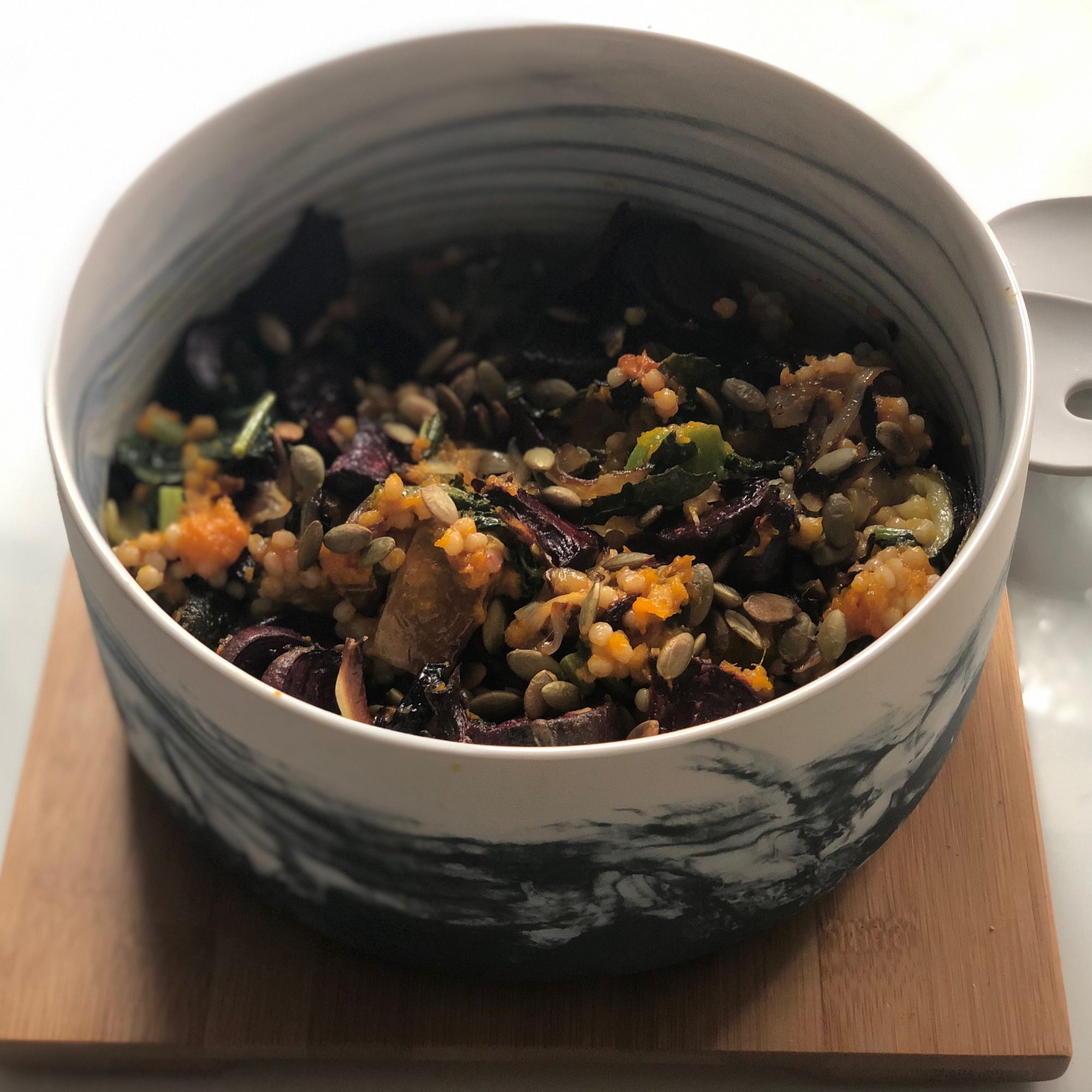 Combine the roasted veg with the cous cous and stir to combine. Top with pepitas to serve.